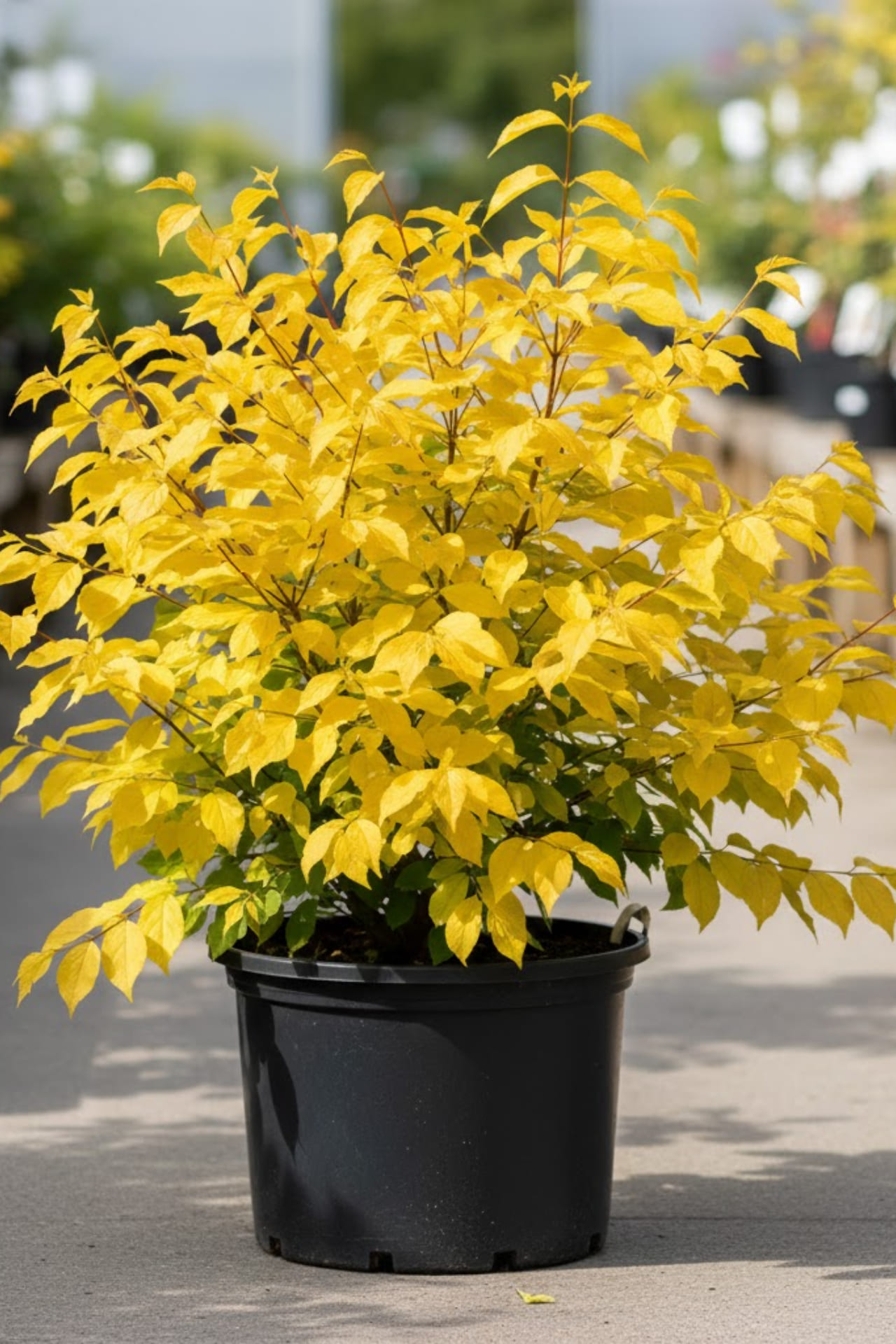 Лиственный кустарник шаровидной формы диаметр 2-3м высота до 2 м, быстрорастущий. Весной его листва ярко желтая, позже она зеленеет и становится зеленовато желтой, осенью практически не меняет летней окраски. Цветки белые, одиночные с сильным ароматом, не терпит застоя влаги, предпочитает солнце и полутень, растент на плодородных, хорошо дренированных почвах, зимостойкий, применется в одиночных посадках
