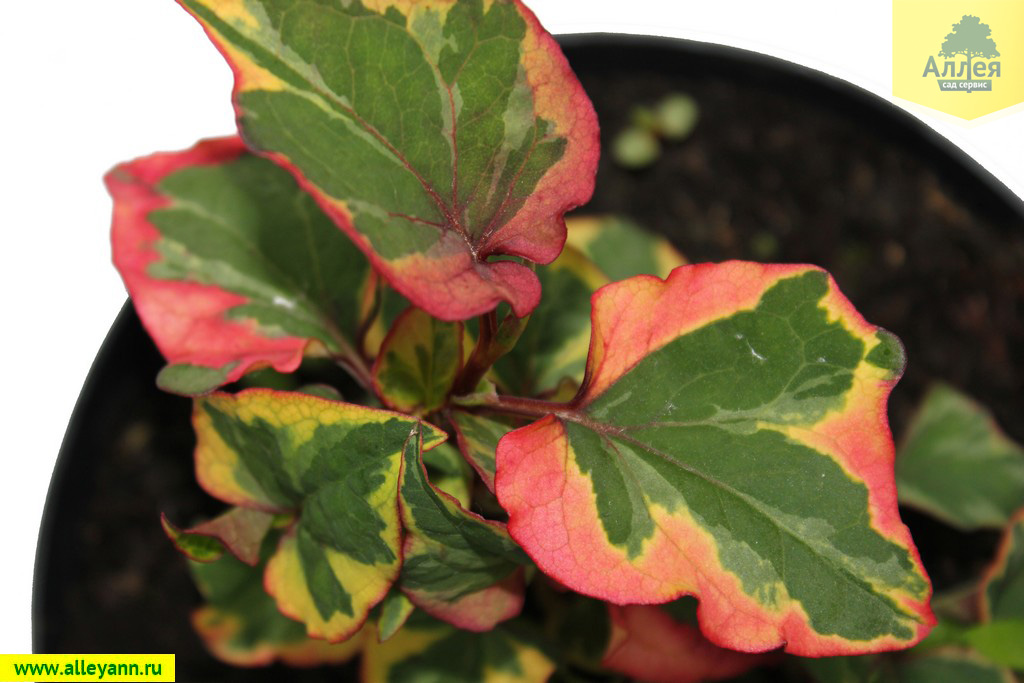 - Стебли красные. Листья зелено-желто-красные, черешковые, цельнокрайние, сердцевидные у основания, с заостренной верхушкой